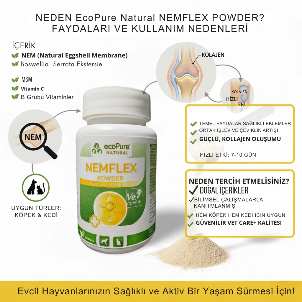 NEMFLEX ® asıl gıda içeriği Doğal Yumurta Kabuğu Membranıdır. NEMFLEX ® , kolajen, hyaluronik asit, kondroitin ve diğer temel glikozaminoglikanlar ve proteinler dahil olmak üzere köpeğinizin kıkırdak ve bağ dokusunu yeniden inşa etmesi için ihtiyaç duyduğu yapı taşlarını içeren doğanın tek kaynaklarından biridir.
