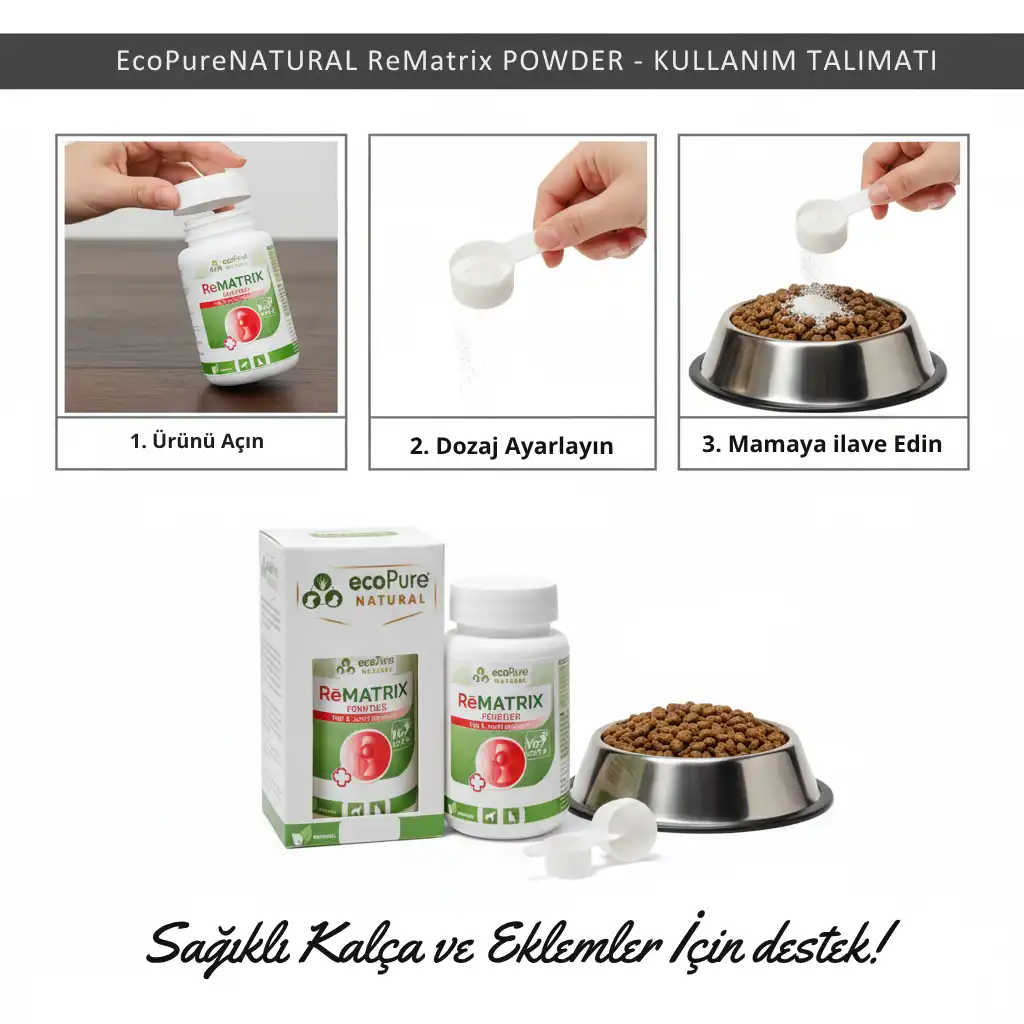 Sonuç olarak eklem ve kas desteği sunan Rematrix, kedi ve köpeklerde hareket sisteminin fizyolojik olarak desteklenmesine yönelik güvenli ve tamamlayıcı bir çözüm sunar. Düzenli kullanım ile genel sağlık ve yaşam konforunun korunmasına katkı sağlar.
