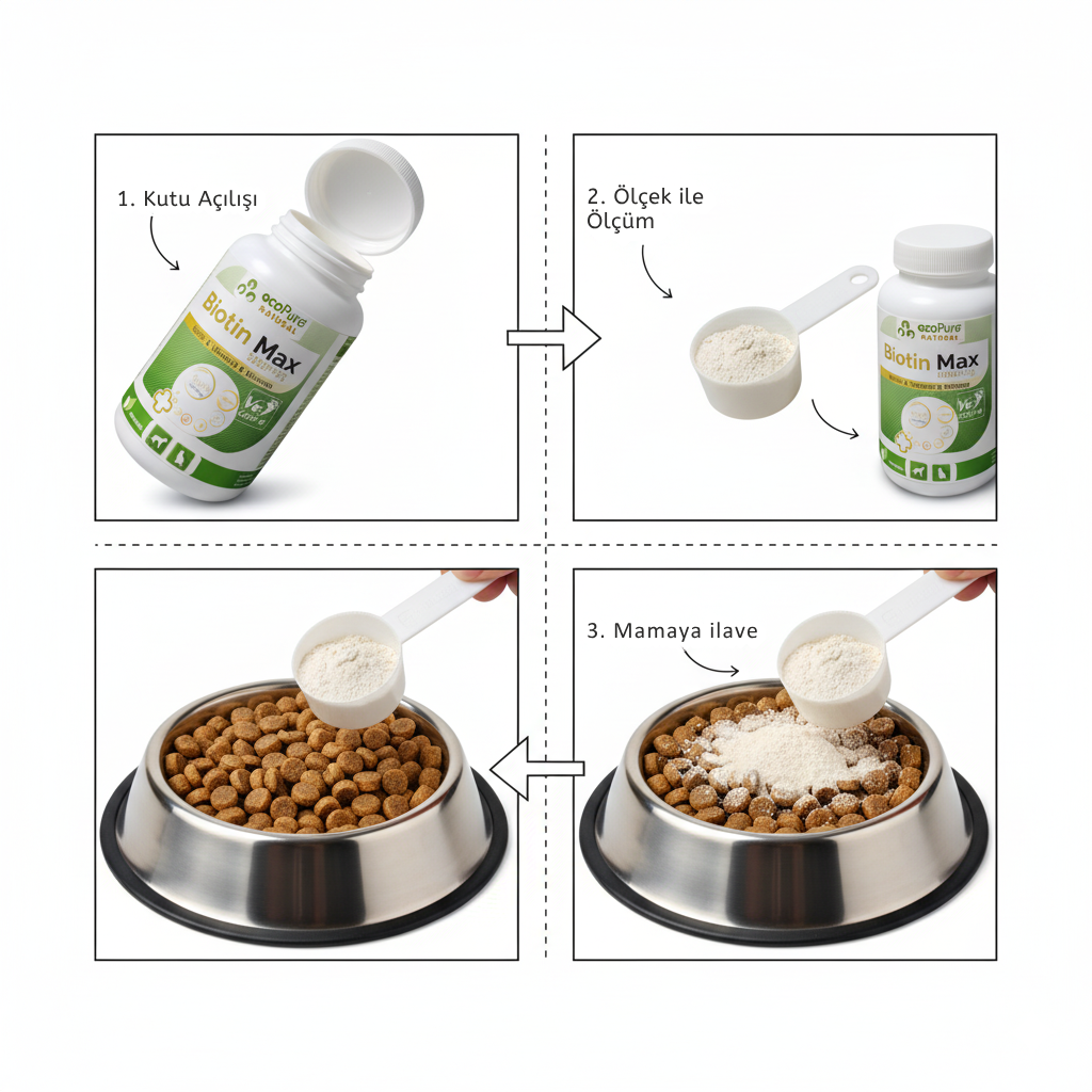 Sonuç olarak deri ve tüy desteği sunan BiotinMax, kedi ve köpeklerde sağlıklı cilt yapısı ve güçlü tüy gelişiminin fizyolojik olarak desteklenmesine yönelik güvenli ve tamamlayıcı bir çözüm sunar. Düzenli kullanım ile bakım kalitesinin ve yaşam konforunun korunmasına katkı sağlar.