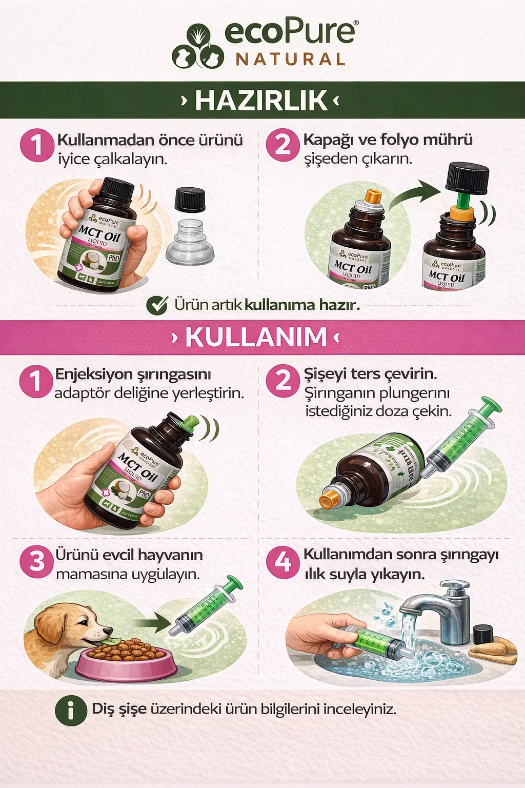 MCT Oil enerji desteği, dengeli beslenme programına kolayca eklenebilir. Özellikle iştahı düşük, zayıflama eğilimli veya yoğun enerji ihtiyacı olan hayvanlarda günlük rasyona pratik şekilde entegre edilir.